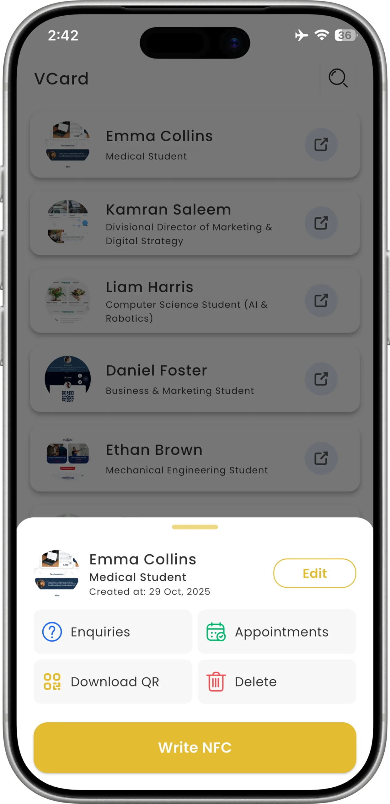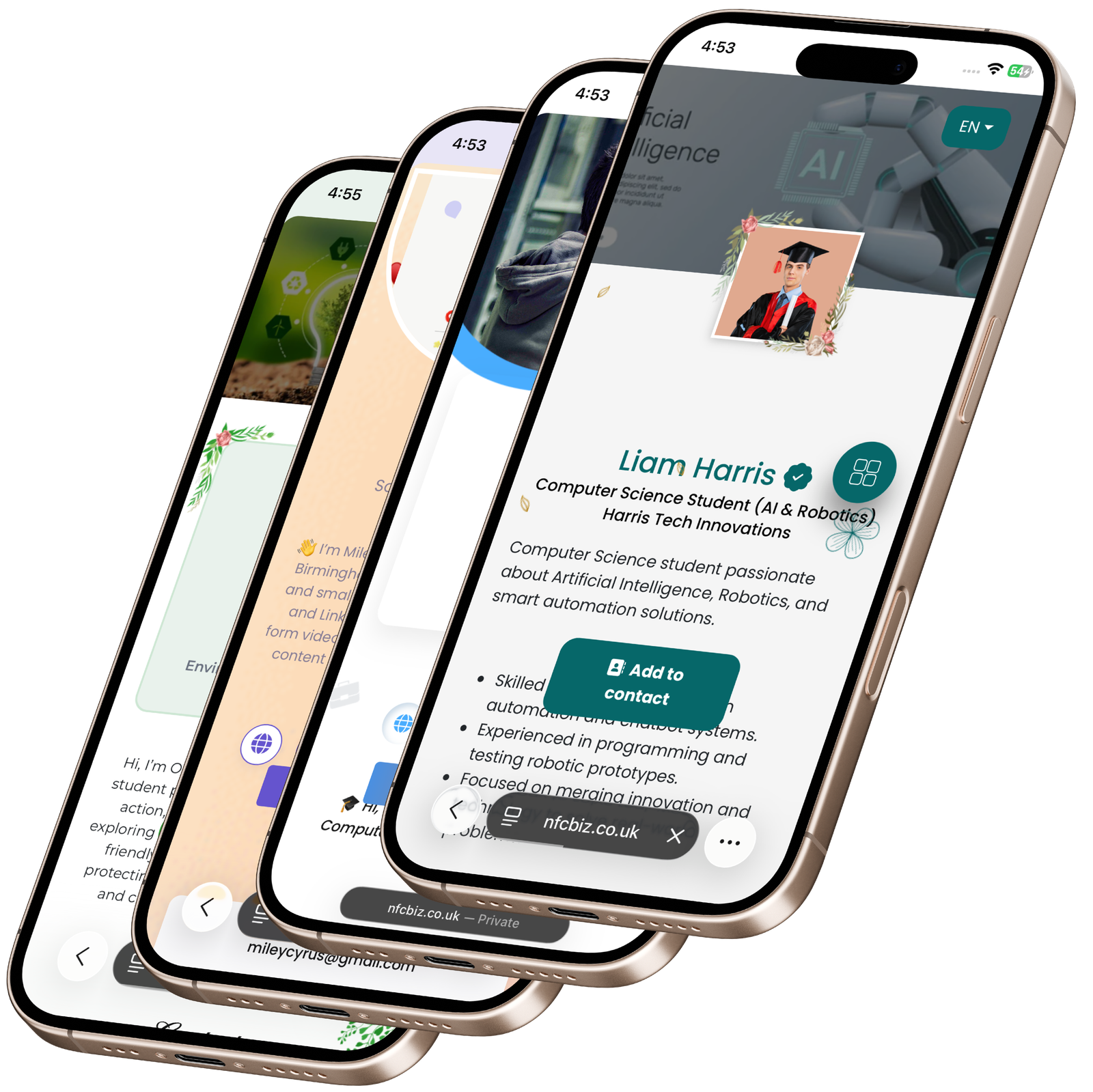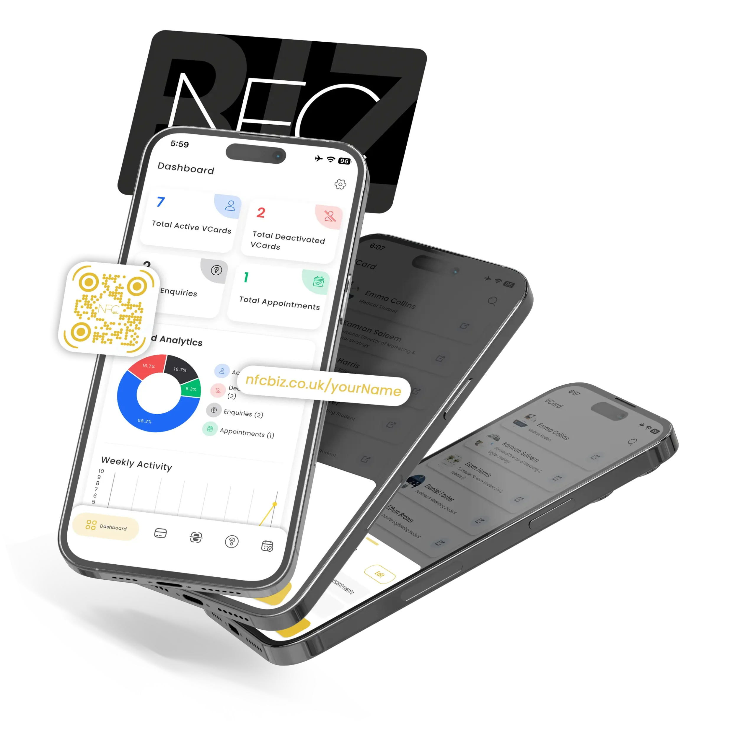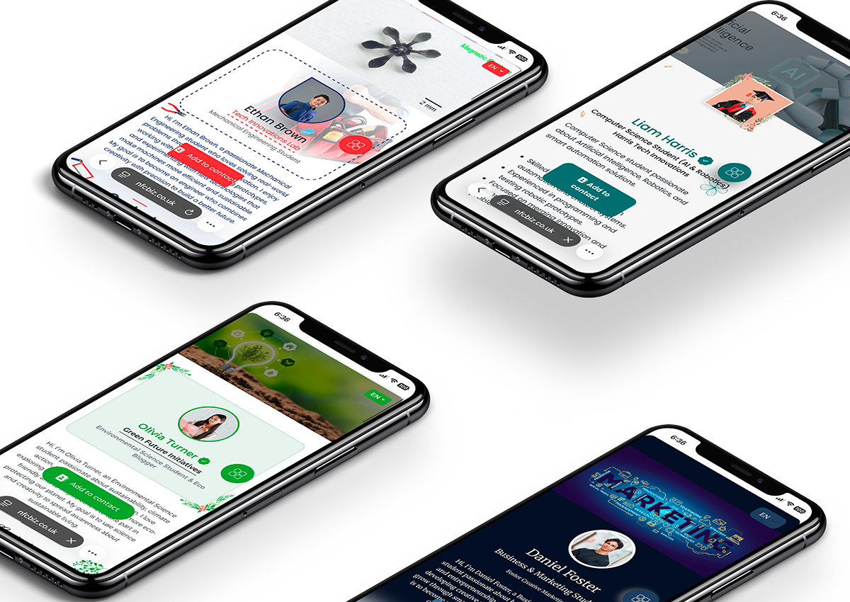 One tap to share your CV, socials and portfolio — from your NFC card, dashboard or mobile app.